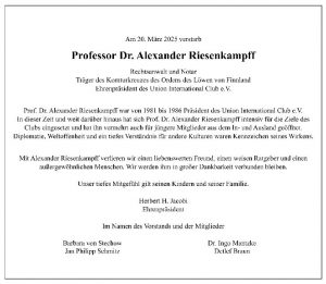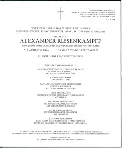 Mit tiefer Betroffenheit haben wir vom Tod unseres Mitglieds Prof. Dr. Alexander Riesenkampff, M.B.A. 1961, am 20. März 2025 erfahren.